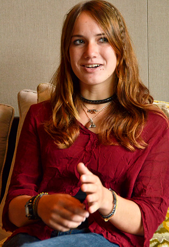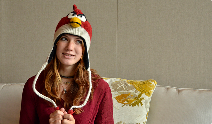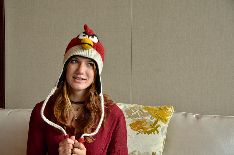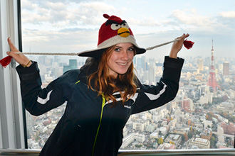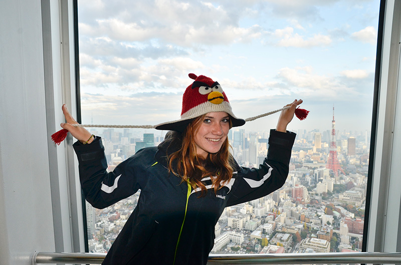 The cute 17-year-old poses playfully at the Roppongi Hills viewing deck. The Angry Birds ski cap was a gift from friends she made on her trip around the world.