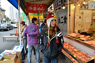 Walking through Tsukiji fish market. In her free time, she wandered around Marunouchi, Roppongi, Harajuku, and Shibuya.
