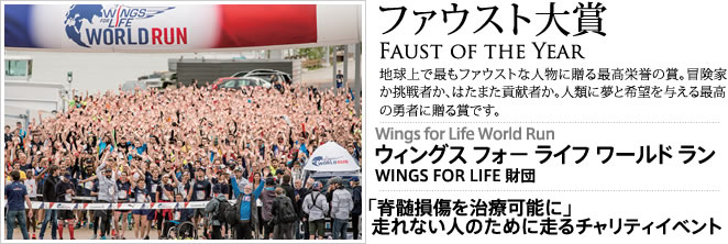トップ写真:左から特別審査委員の片山右京さん、冒険家賞の堀井誠さん、挑戦者賞の千代勝正さん、ファウスト・オブ・ザ・イヤーのWings for Life World Runを代表して日本大会アンバサダーの砂田貴裕さん、社会貢献活動賞の特定非営利活動法人ピースウィンズ・ジャパン(国際NGO団体)の大西純子さん、原田一兵さん、夢之丞、冒険家賞の藤田昌彦・雄大親子に代わり、代理で授賞式にご登壇頂いた熱気球運営機構会長の町田耕造さん、特別協賛社の株式会社サイバード代表取締役社長 兼 グループCEOの堀主知ロバートさん。