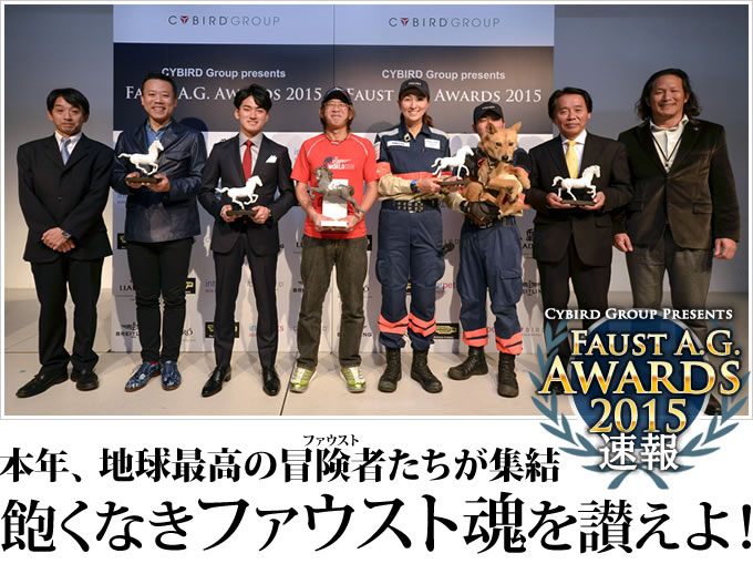 地球上で最も活躍した冒険家、挑戦者、社会貢献活動を表彰するサイバードグループ・プレゼンツ「ファウストA.G.アワード」。2015年12月7日、第7回目となる授賞式および記者発表が、特別協賛社である株式会社サイバードの本社(代官山)1階、Theatre CYBIRD(シアターサイバード)にて執り行われた。人類に夢と希望とロマンを与える“ファウストな”人物および団体を独自の観点で讃えるこの授賞式に、テレビ、新聞、雑誌、WEBなど各メディアから多くの報道陣が出席。各界の勇者が表彰され、受賞の声が述べられる度に、会場は功績を讃える拍手で包まれた。