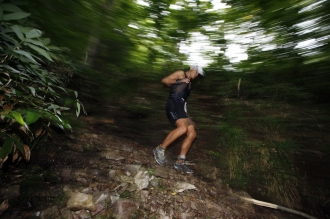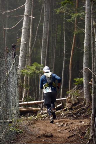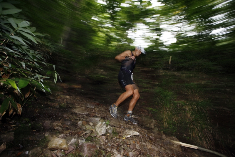 F 下りはね、走っているというより飛んでいるイメージです。着地点だけを見つけて、リズムを崩さないように。土と木の上にだけは着地しないのが、トレランの走り方なんですよ。土は濡れていると滑りやすい。木はもう絶対に滑りますから。石の上を飛んで行くように、ポンポンと蹴るようにやっていかないといけないんです。