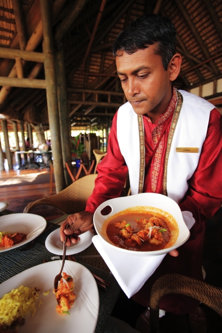 ラグーンを一望する水辺のレストラン『ルソイ・バイ・ヴィネート』は、ミシュランのスターシェフ、ヴィネート・バティアがプロデュースするコンテンポラリーなインディアン・レストラン。青空と海が鮮やかなランチ、波の音がリラックスした空気を作り出すディナーと、時間帯によって異なる表情を見せるのも『ルソイ・バイ・ヴィネート』の特徴だろう。