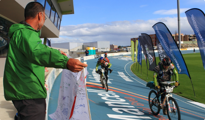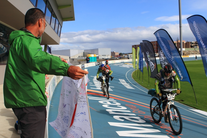 「ゴールは間近。ここは本気で行こう!」と言う気持ちが伝わってくる。きついアップダウンの道のりが続く。汚れと日焼けが混じり選手たちの顔がどこかたくましく見えた。海岸沿いを走りきり、ついにゴールとなる会場が見えてきた。ゲートを入り、もはや観客はまばらのスタンドの中、トラックを2周する。その間、スタッフやすでにゴールしている選手たちの拍手が会場に響く。重鎮はゴールラインで応援メッセージの書かれた国旗を広げて、3人を待っていた。