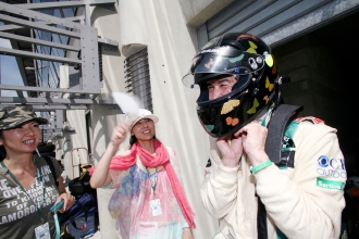 ちなみに、サーキットではカークラブのファミリー走行やメーカーのデモンストレーション走行なども開催されるため、レースマシンはすぐに入れない。サーキットへの誘導を待つ間、入り口近くのレーンに並べさせられる。海外のイベントが楽しく思えるのは実はこのとき。ここではドライバー&マシンと、多くの来場者やファンとが自由に交流できる、オープンスペースとなっている。ドライバーの緊張をほぐしてくれるいい時間だ……。