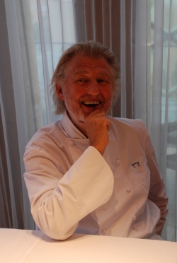 白と言おうかブラウンと言おうか。輝く髪を、古来日本では賢者や山伏がそうであった総髪のように無造作に後ろへ流し、頬には髭を蓄えた顔。真っ白なコックコートをまとったがっしりした長身。一種、古代の魔術師のようでもある風貌は、彼が鬼才の持主であることを証明しているようだ。