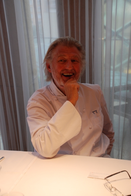 青山に構える自身の名を冠したレストランに、年4度、季節のメニューを新たにするために来日するピエール・ガニェール氏。滞在期間中は、自身がこの東京店の厨房に立って料理を提供する、スペシャルウイークを開催する。その最終日の休憩時間に、東京店の個室に現われた氏は今年で59歳になるのだが、連日のハードスケジュールと厨房の指揮を執っていた疲れを、みじんも感じさせなかった。