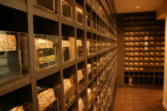 グラン クリュ カフェの豆は、セラーの中ではまだ淡緑色の生豆の状態だ。彼らは真空パックされて、快適な棚の中でひっそりと呼び出されるのを待っている。そうして口にされる直前に、注意深く焙煎を行い、シャンパンボトルに詰められて主人の元に送り出される。瓶の中では、発生する炭酸ガスが充満し、栓を抜く際には「ポン!」と勢いよく晴れやかな音がする。それは世界各地で生産者と川島が育てた夢が凝縮され、いよいよ空中に解き放たれるというときに上げる喜びの声だ。