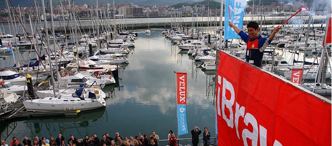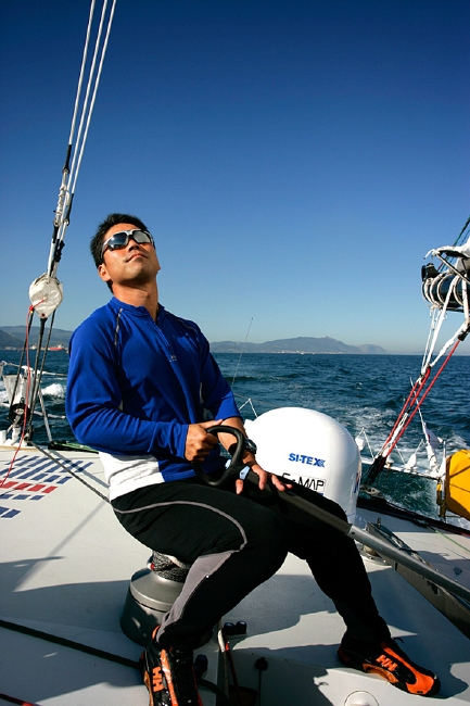 2006年、単独世界一周ヨットレース「5-OCEANS」に日本人初のクラスⅠにて2位の快挙。ゴールのスペイン・ビルバオにて。