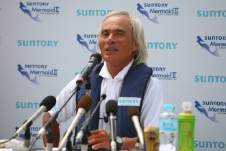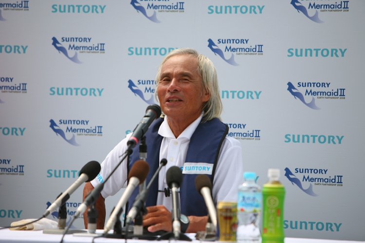 2008年、波浪推進船「サントリー マーメイドII号」でハワイ~紀伊水道間の単独航海を世界で始めて成功させた際(トップ写真)の記者会見にて。