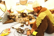 「ナマステ。昨日無事に標高5300mのベースキャンプに入りました。そして先ほど、衛星とWi-Fiの基地建設終了。これでエベレストからつぶやけます! ここまで来るのに涙です。高山病に苦しみながらも基地を作ってくれた隊員に感謝です」