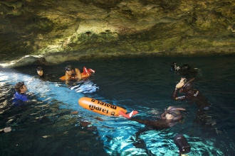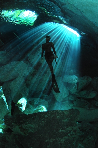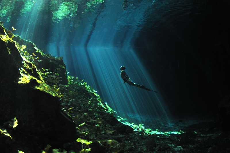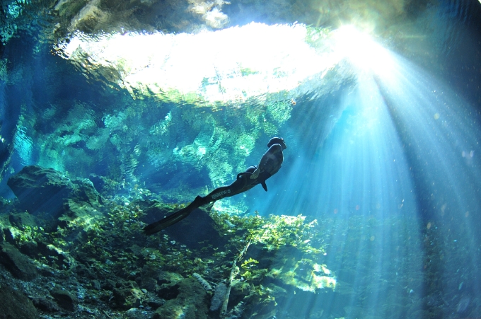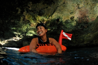「海水は潜ると下から突き上げるような浮力があるんですけど、洞窟は塩分がないのでス-ッと泳ぎに入っていけるんです」