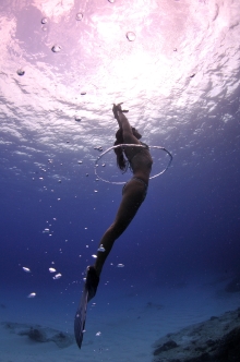 水深5mをロ-プに沿って泳ぐ様は、優雅さに満ちている。その姿は、魚のようにも哺乳類のようにも見える。少なくとも人間がプ-ルで泳いでいるような不自然さはない。