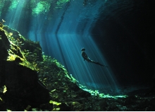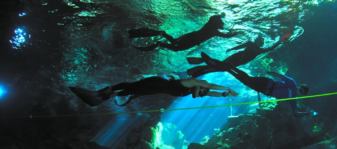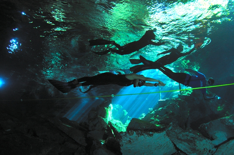 目前のロ-プを目印に、洞窟内を進んでいく。ゆったりとした時間が流れ、それは水の中を泳ぐというよりも時を泳ぐような感じになるという。そして、最後のカ-ブを曲がると、残りは数十mになった。