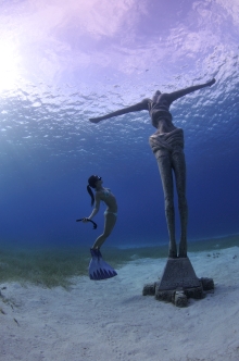 深みかかったブル-の海の中を光のスポットライトが降り注ぐ。そのステ-ジの中を人間が悠々と泳いでいる。その姿に、人工的な違和感はない。水に反発するのではなく、あらゆるものと融和した優美さがある。
