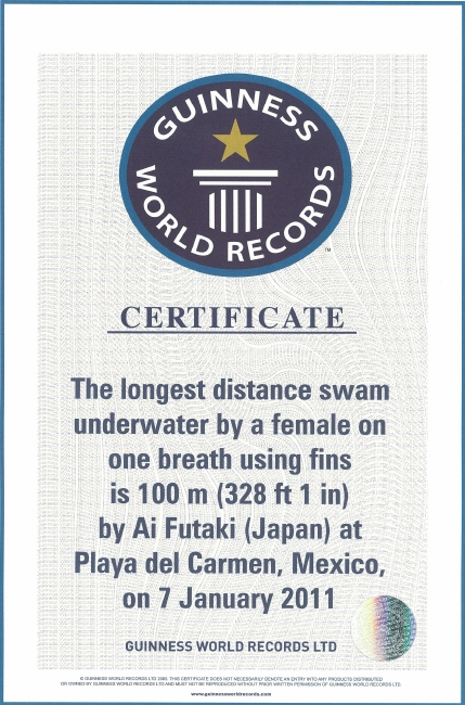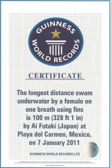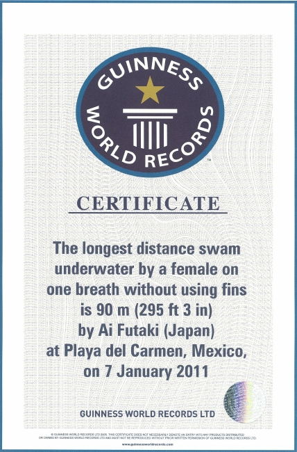 余力を残し、名残惜しそうに水面に向けて上がって行く。水上ではギネス挑戦を支えた仲間が待っていた。自然と歓喜の人の輪が出来る。二木は、フィン有りでは、100m(1分52秒)で世界で女性初の記録、フィンなしでは90m(2分2秒)で世界で人類初の記録を達成したのである。ちなみにフィンなしの方は、ギネス協会が新たにカテゴリーをつくってくれた。