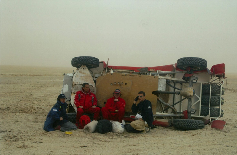 パリダカのクラッシュはだいたいパターンが決まっているという。クルマの進行方向に小高い丘となってそびえる砂丘で、ラリーカーは時速150kmほどのスピードを出す事ができる。当然砂丘の頂点の裏側は見えないが、勝つためにはアクセルを緩めるわけにはいかない。なぜならそこでアクセルを緩め、砂丘を一つ越えるのに10秒ロスしたとすると、200の砂丘なら30分以上のロスタイムになるからだ。勝つためには、そこでアクセルを踏むか否かにかかっている。このときは砂丘の裏側が落ち込んでおり、クルマはほぼ垂直に落下。時速150kmで地面と正面衝突となった。