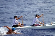 「サメが恐いのでシャ-クシ-ルドという5mぐらいの電気バリアを作って、その後を泳ぎました。あと、ダツですね。口ばしが尖っていて、よくダイバ-が刺されるので、夜中は頭に着けた自転車のフラッシュライトと、伴走するカヌ-の灯のみで泳ぎました。幸い、海亀やクジラは見えたけど、サメにもダツにも遭遇しなかった。ただ、相馬出身の山田君は、かつおのえぼし(猛毒クラゲ)に刺されて、かなり痛い目に合いましたけど」