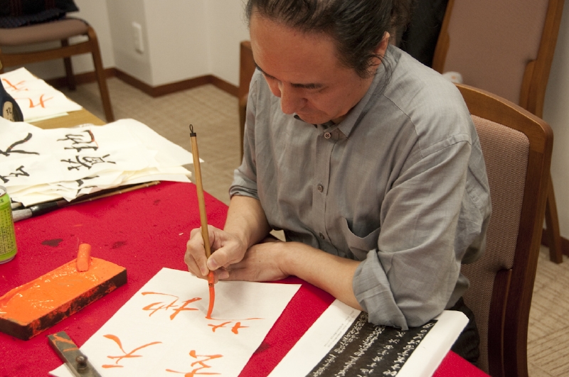 たとえば料理。世界でも注目を集めるレストランNOBUのオーナーNOBU MATSUHISAと食とアートのコラボレーションを実現。 レセプションでは、笛方藤田流十一世宗家藤田六郎兵衛氏の笛にあわせ、 書をしたためるパフォーマンスを行った。