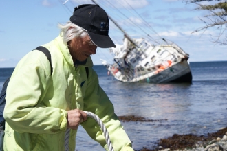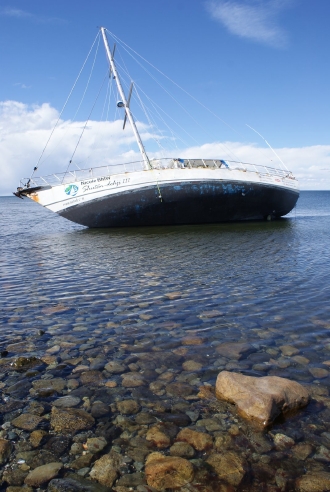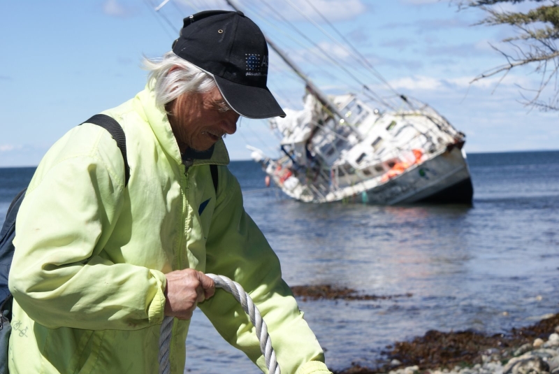 プンタアレナス近郊にて、引き潮時の「Nicole BMW Shuten-DohjiⅢ」を見る斉藤さん。満潮時にはそのまま出航可能。