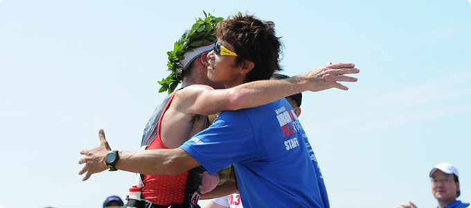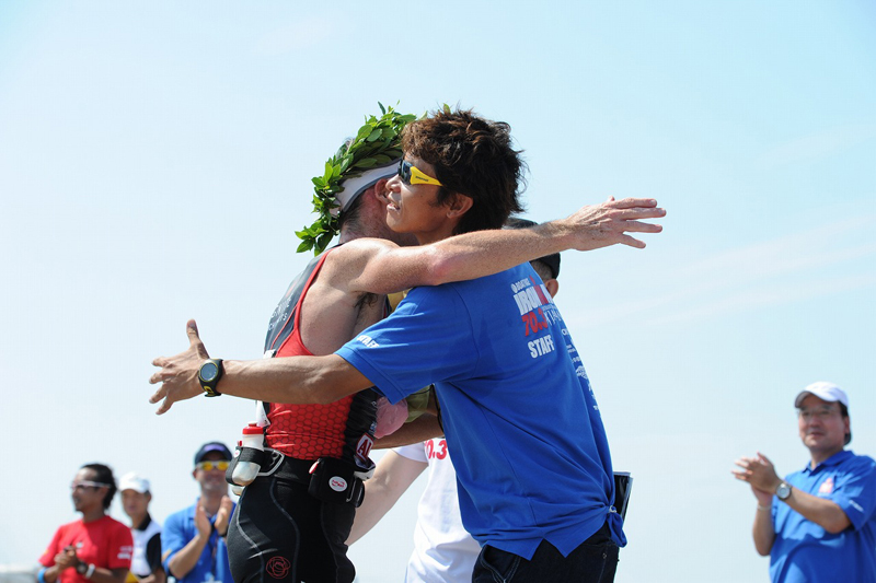アスロニアが運営する愛知県常滑市の「アイアンマン70.3セントレア常滑ジャパン」にて、白戸はゴールで一人ひとり選手を迎え入れる。
