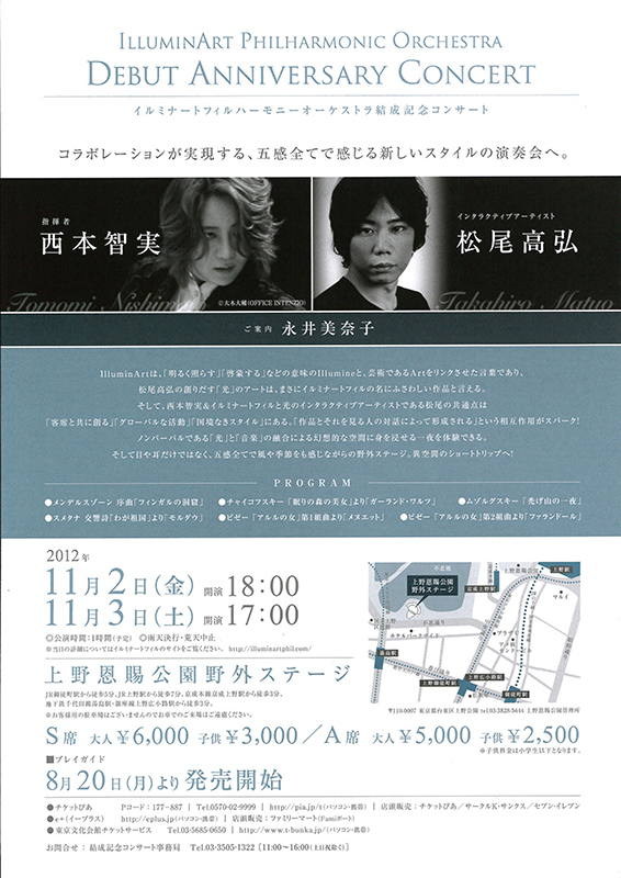 永井 今回の結成記念コンサートはインタラクティブアーティストの松尾高弘さんとのコラボレーションですね。「上野が音楽と光に包まれる」という大変興味深いサブタイトルがついています。ステージ構成やプログラムはどのように決められたのですか。