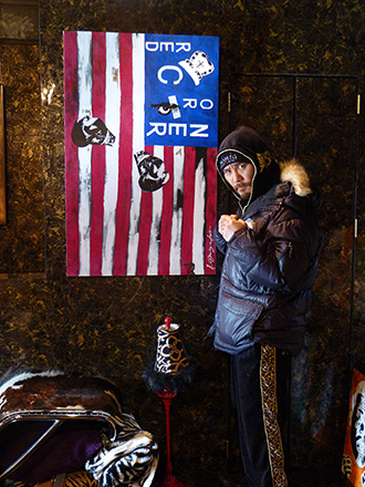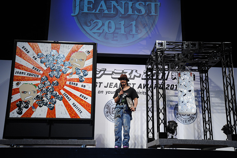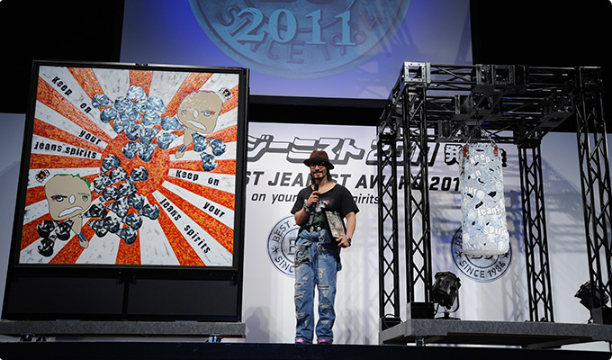 2011年、ベストジーニストアワード授賞式にて、鬼塚の左の絵と右のサンドバッグも作品。作品のテーマには自然とボクシングが現れる。