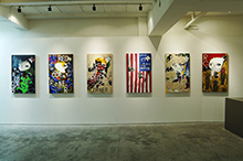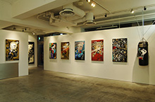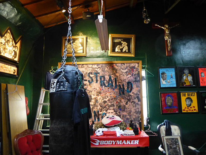 写真上下:福岡のスパンキーK・セークリット・ボクシングホールにて。トレーニングエリアにも作品がいっぱいだ。(Photos: Takahiro Nishida)