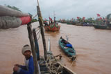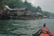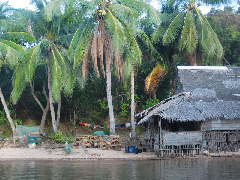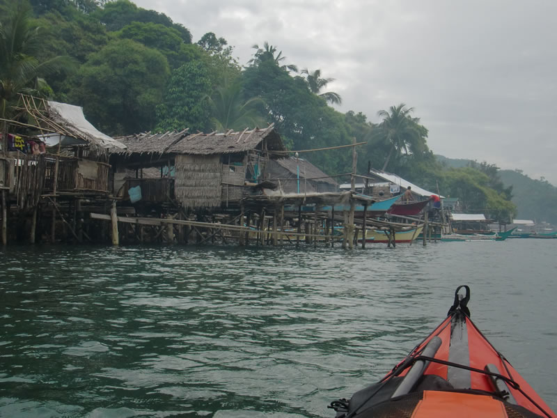 (上)インドネシアのとある海、油を引いたような海面に手を休める。(左下)自然災害の少ないフィリピン、パラワン諸島の漁村は、海に面して暮らしを続けていた。(右下)ブスアンガ島では、日本の舟屋のような景色に出逢った。