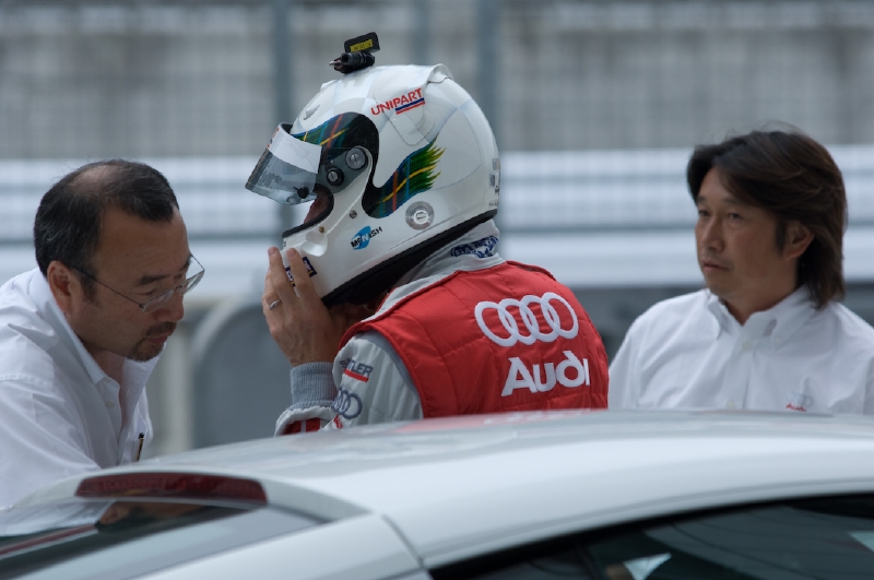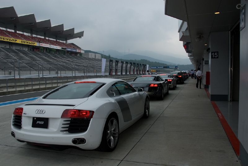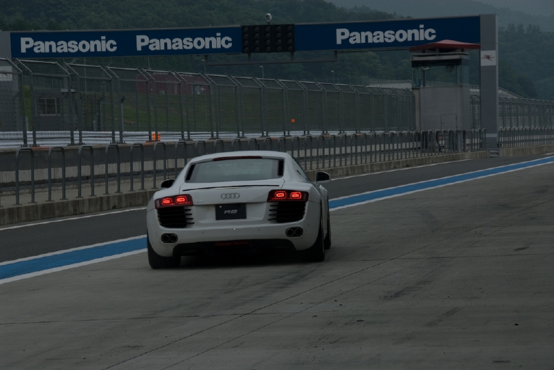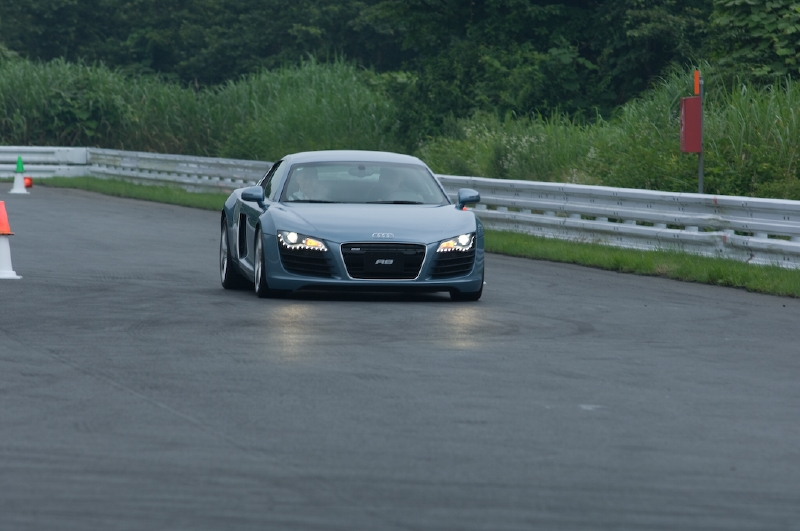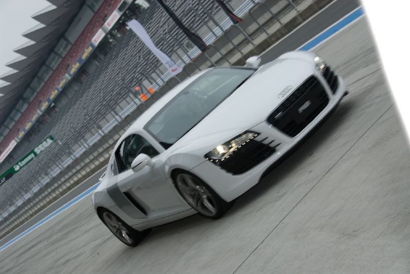 そしてレーシングコースへ移動します。全長4563m、言わずと知れた2008年日本グランプリが開催された国際規格のコースです。ここでは、ゲストドラ イバーにル・マン2008チャンピオンのアラン・マクニッシュ氏、ル・マン2004チャンピオンの荒 聖治氏、ル・マン2008にも参戦した元F1ドライバー野田秀樹氏をお招きし、まずは彼らのR8に同乗してコースを周回、本格的な運転テクニックを助手席 で学びます。