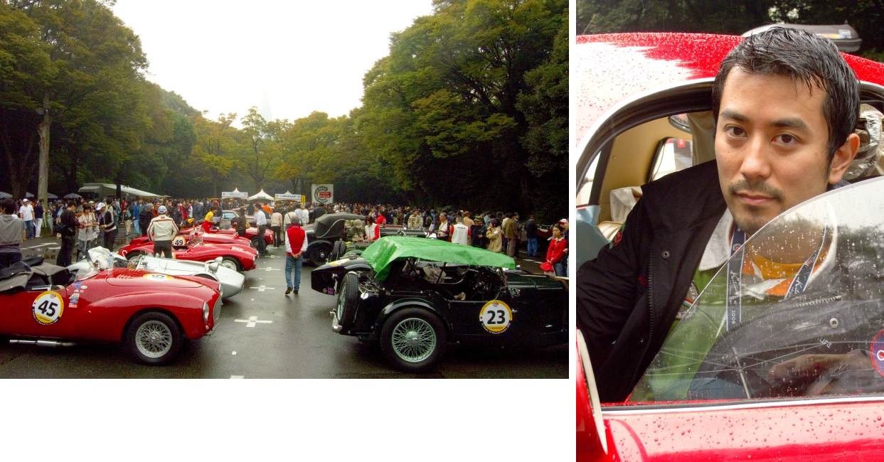 右:ラ フェスタ ミッレ ミリアのゲート。レースは、戦前から1967年までに製造されたヒストリックカーで東京・原宿の明治神宮前から日光、猪苗代、裏磐梯、白石、郡山などの名所旧跡を巡りおよそ1600km(1000マイル)のルートを踏破するもの。