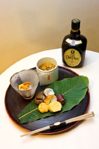 左/今回のイベントは、徳川将軍家の菩提寺である増上寺で開催された。一方、オールドパーは明治新政府樹立に尽力した岩倉具視の遣欧使節団が日本に紹介したとされるもの。両者が21世紀に響宴を共催することになるとは誰が想像しただろう。右/舞台の後の晩餐会では,料亭『金田中』によるオールドパーに合う料理が振舞われた。