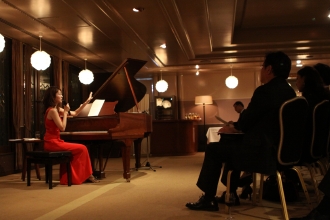 「小さな頃にピアノを習っていたので今日の演奏が楽しみ」「クラシックには詳しくないけれど、本物を極めるファウストA.G.のイベントなので勉強したい」――ウェルカムドリンクと、美しく並べられたフィンガーフードを楽しみながら、ファウストたちの会話が軽やかに交差する。また、ファウストA.G.とは縁が深く、昨年の「Faust Gala Party 2009」でも協賛企業として参加した「グランドコリアレジャー」のCEO・権五南(クォン・ナオム)氏も、この日のために韓国から来日し、ファウストたちとの挨拶や歓談に花を咲かせた。