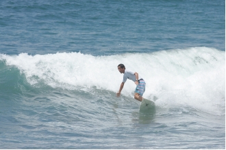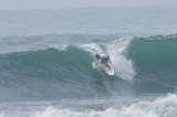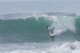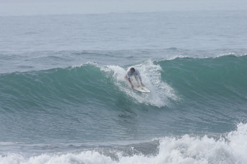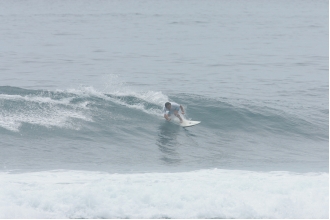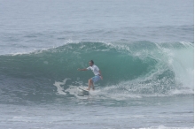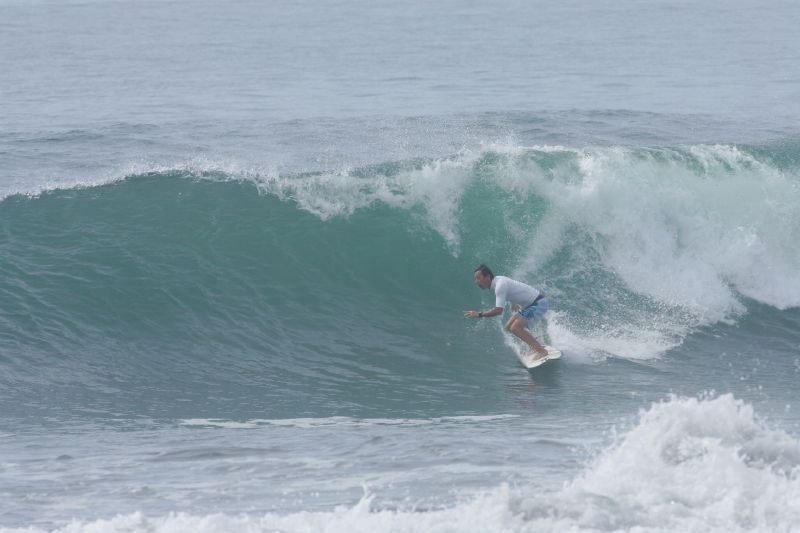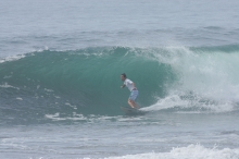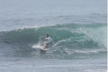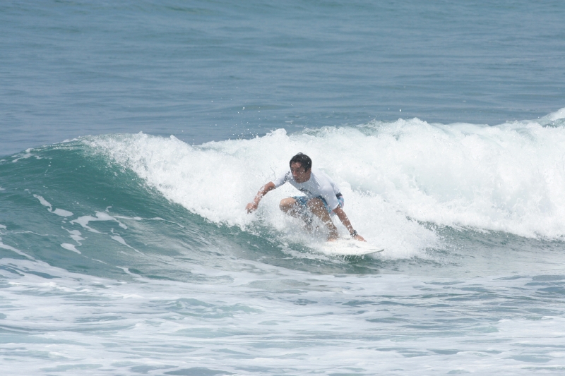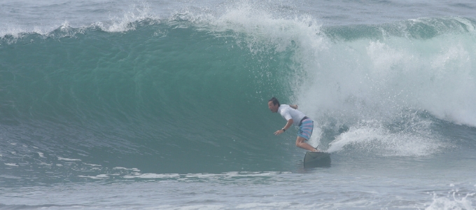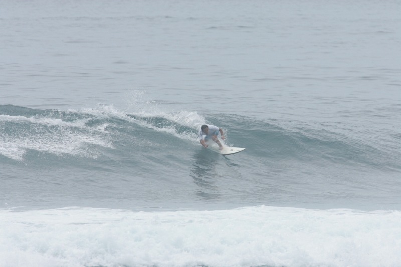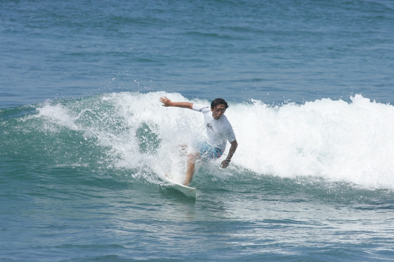「自分のサ-フィンは、エンジョイじゃないですね。ワイキキの波にロングでフラフラ乗るのもいいけど、ダブルに挑む緊張感の方が好きです。昨年、バリに小川クンらと行ったんですが、本当に波が凄かったんですよ。たまたま、チェックしたら頭半ぐらいのサイズでチュ-ブ巻いている。アウトでなく、パドルで行けるポイントだったし、幸いなことに誰もいない。『たぶん、大丈夫だから行く?』、みたいな話になって、入ったんです。そうしたら、いきなりダブルサイズの大きなセットが2発連続で入って来て、本当にヤバかった。なんとかアウトに出て、小川クンが『行くよ』って、テイクオフしたんだけど、ワイプアウト※している。パワ-ありすぎって感じなんです。そこで、自分も覚悟を決めましたね。たまたまセットが見えたので、もう必死でパドルをしたんです。で、無我夢中で『行こう!』って、立ったら立てた。ボ-ドが物凄いスピ-ドで降りて行って、自分の後ではチュ-ブがグリグリ巻いていた。もう、最高でしたね! 思わず声が出てしまいましたもん! 危険なスポ-ツなので無理は禁物ですけど、恐怖を克服して波を攻めるのは最高に楽しい瞬間ですね」
