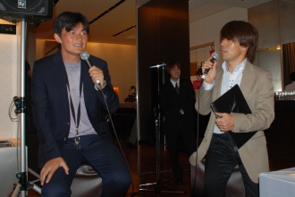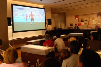 午後8時過ぎ、応援グッズを身にまとったファウストとその友人たちがドリンクとフィンガーフードを楽しみながら試合開始を待っていると、このイベントのスペシャルゲストで元サッカー日本代表・岩本輝雄氏と、MCのアナウンサー大庭荘介氏が会場に現れた。マイクを手にした2人は、「実はルイ・ヴィトンが、今回のワールドカップトロフィーのキャリーケースを製作していることから、このイベントが成立した」――という逸話や、「オランダに勝つ秘訣は前半で先制点を獲ること」――といった解説&ライヴトークで会場を盛り上げた。普通のパブリックビューイングでは決して味わえない、贅沢なトークに会場全体が熱中するなか、時計はキックオフの午後8時30分。特設巨大スクリーンに、ついにピッチに入場するイレブンたちの姿が映し出された。