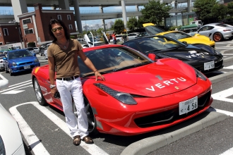 銀座では、高級モバイルフォンのVERTUの銀座ショップでドライバーたちへの“給水”を受けた後、青山界隈へ。そして六本木へと戻ります。VERTUに寄ったのはここがフェラーリとのコラボフォンを商品としてラインナップしているからです。メタル部分はもちろん、レザーからステッチまでフェラーリと同じ素材が使われています。