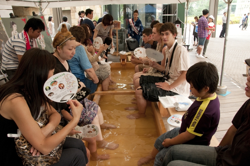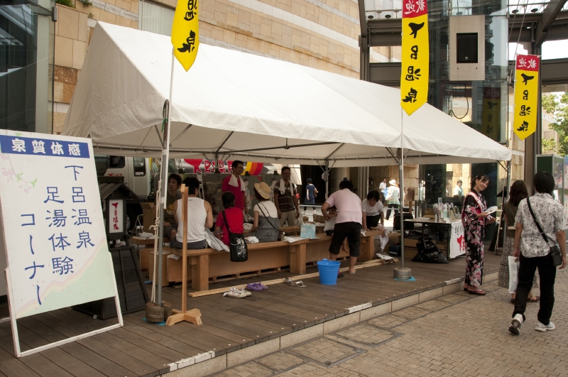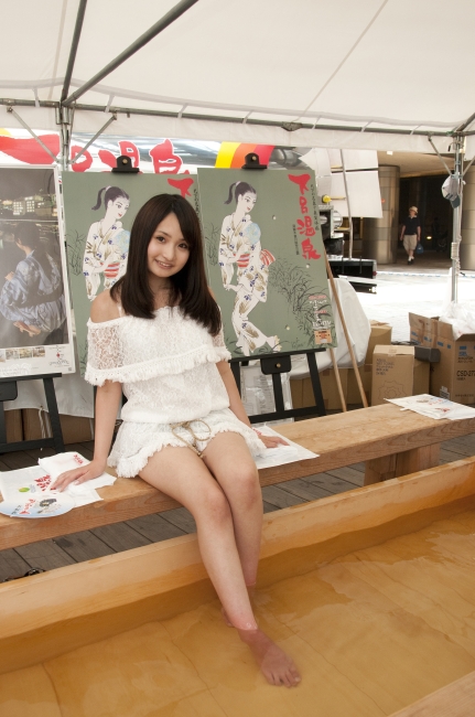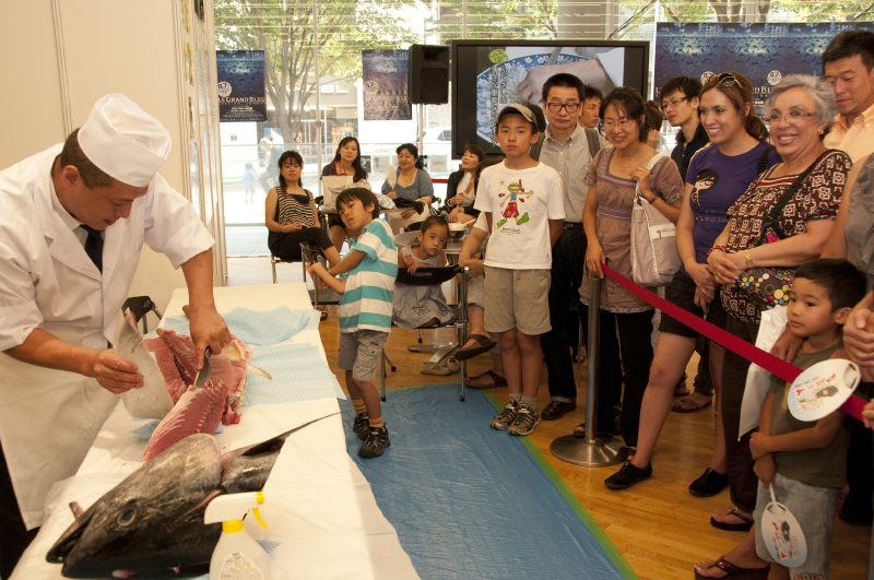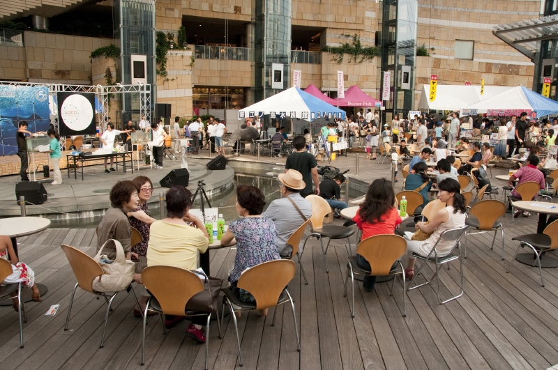会場となった六本木ヒルズアリーナには、アクアリウムディスプレイコレクションの出展者による美しいアクアリウムがずらりと並び、涼しさを演出。新江の島水族館ブースでは子どもにヒトデなど海の生き物とのふれあいを提供したり、下呂温泉ブースでは、はるばる岐阜から温泉を運んでヒノキの足湯が設られたりと、数多くの来場者が癒され、憩う。また恒例となった「海メシ カフェ」では、下関唐戸市場から直送のトラフグや、マグロなどの新鮮な海の幸を使った海メシに、大勢の人々が舌鼓を打った。金魚すくいやヨーヨー釣りもあり、夏祭りのようなにぎわいに包まれていた。