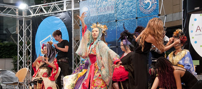 チームTOJOがベストアクアリウムディスプレイアワードを受賞。喜び一杯の笑顔を見せた。(上段)ステージ最後のイベントは、音楽に合わせ、ダンス、ヘア、ネイル、メイクで独特の世界を作る「Rhythm Beauty Project 竜宮城」。多くの人が足をとめた。(下段)