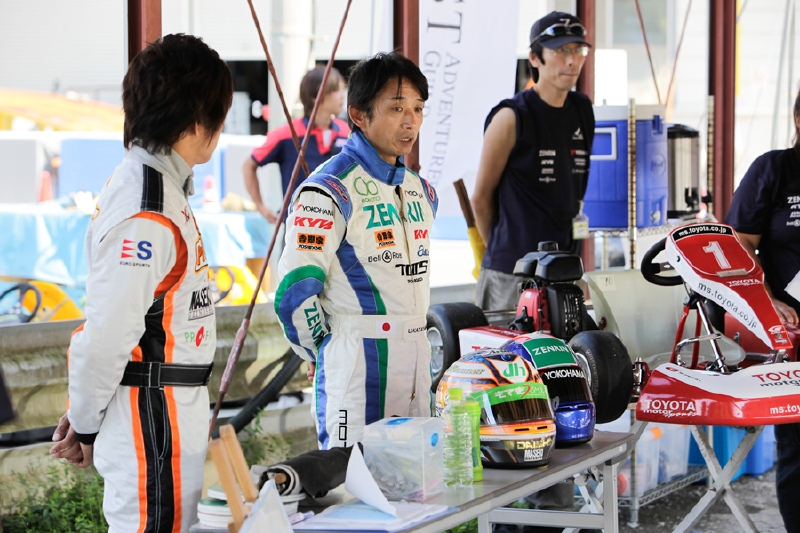 上段:カートに乗り込む前に、真剣な表情で説明をしていた片山右京氏。下段:千代勝正氏とともに、子供一人ひとりに対し親身にレクチャー。