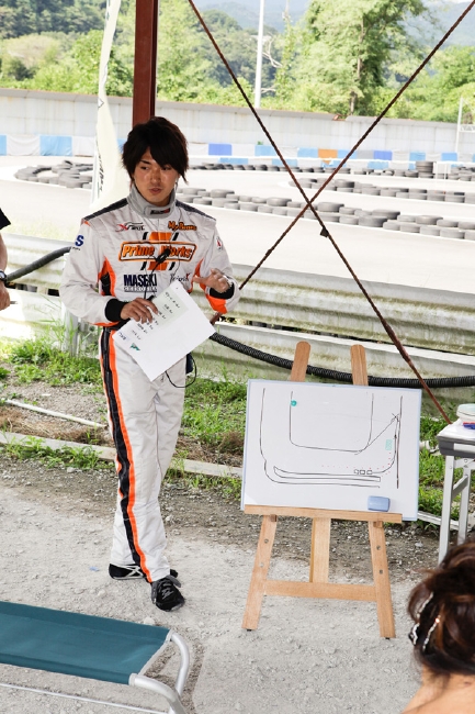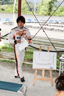 サーキットでファウストと子供たちを迎え入れてくれたのは、片山右京氏のほか、サポート役の現役F3レーサー千代勝正氏とスタッフの面々。アットホームな雰囲気のなか、ジョークを交えた全員の自己紹介が終わると、参加者を前にして片山氏は真剣な表情で口を開いた。