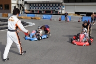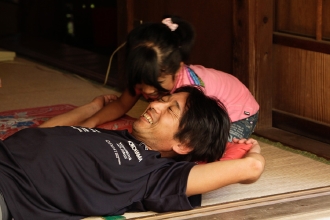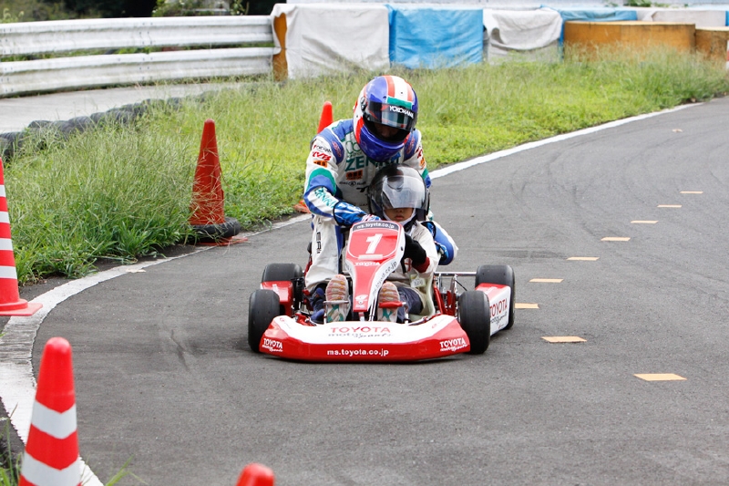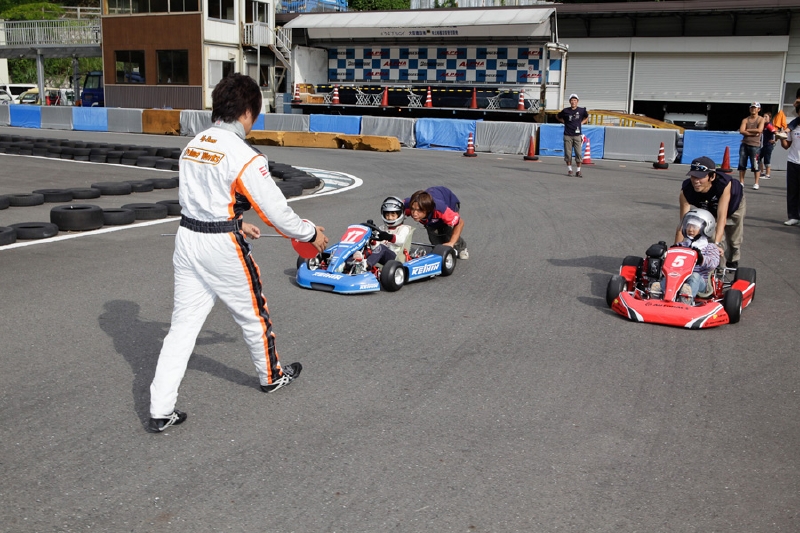 「もう嫌だ!怖い!帰る!」と泣き続ける子に対し、そのちいさな子供用カートの脇に器用にちょこんと同乗。ハンドルをサポートしながら、右足のアクセル、左足のブレーキのタイミングを言葉で伝え、文字通りつきっきりの指導で、最後までカートに同乗走行、自力でやり遂げさせたのである。
