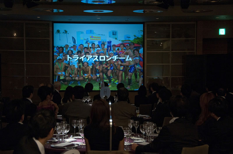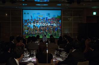 定刻の19時を少し過ぎたところで、司会者が開会をアナウンスする。最初に運営事務局長より1年間の活動報告があり、マルチビジョンに様々な冒険や挑戦のダイジェストが映し出される。「会員の皆様のご協力で、コンテンツは着実に増えております。皆様の挑戦をひとつの物語として追いかけてきました」という説明を、マルチビジョンの映像が追いかける。