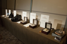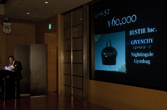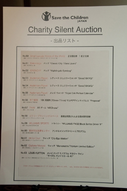 「チャリティ」と銘打つこのディナーでは、昨年同様に2つのチャリティオークションが開催されている。1つが「サイレントオークション」。当クラブ及びイベントのチャリティ精神に共鳴いただいた各社各ブランドより出品された14のアイテムを、出席者たちは興味深く見つめる。テーブルを離れたアイテムの陳列コーナー付近は席の離れた会員同士の気楽な交流の場ともなる。収益金の一部は、こちらもおなじみ、社団法人セーブ・ザ・チルドレン・ジャパンへの寄付として活かされる。「貢献」という二文字を胸に刻む彼らが、積極的に参加したのは言うまでもない。