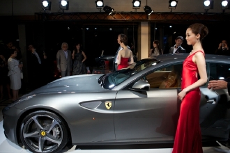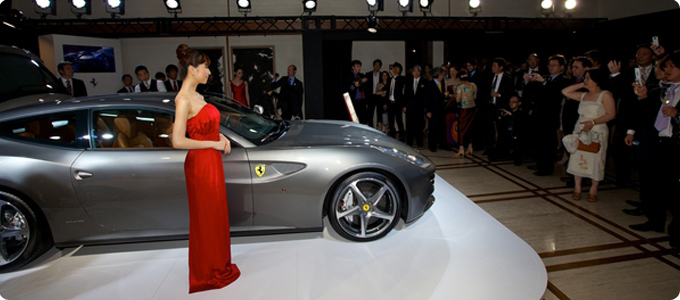 艶っぽいと形容したのは、やはりイタリアンブランドの象徴ともいえるフェラーリの華やかさに由来する。赤いベールで覆われたフェラーリ「FF」のボディラインもそうだし、玄関前に並べられた458イタリアとカリフォルニアの2ショットも、見る者をワクワクさせる。会場に色を添える淑女たちを含め、まさに艶やかな一夜であることは間違いない。