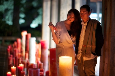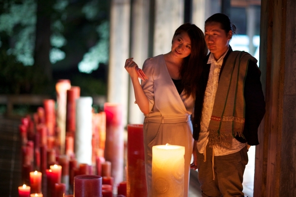 会場となるイタリア大使館の庭先テラスにはたくさんのキャンドルが並べられた。アレンジしたのはキャンドル・アーティストのCandle JUNE(キャンドル・ジュン 写真右)氏。暗闇に幻想的な世界が浮かび上がる。