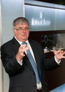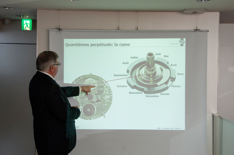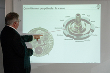 その主な内容は、オーデマ ピゲ本社を置くスイスのジュウ渓谷での時計産業の話、また時計作りの歴史からトゥールビヨン、ミニッツ・リピーター、永久カレンダーなどのコンプリケーション・ウォッチ(複雑時計=オート・オロロジュリ)と呼ばれる時計についての少し難解な解説。最後に今回のメインテーマでもある「スケルトン」、つまり構造が透けて見える時計についての詳しい話を聞くことができた。