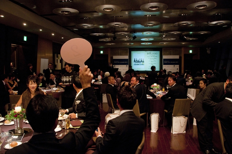 さらなるお楽しみは、毎年おなじみのヴィンテージワインのライブオークションだ。壇上のオークショニアの軽妙なトークとともに、次々と貴重なワインが落札された。入札希望者はオークション参加番号が書かれたボードを頭上に掲げ、当然、希望者がひとりになるまで価格が上がっていくのだが、なかには顔見知り同士が競り合う場面も。お互いに苦笑いを浮かべながらも、このときばかりは、“ファウストらしい大人げない”争奪戦が繰り広げられたのは言うまでもない。