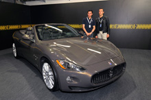 まずは、ファッションブランド「フェンディ」とのコラボレーションによる限定モデル「マセラティ グランカブリオ フェンディ」の登場。オーナーやメディアが注目する中アンベールされると、フェンディ家三代目のデザイナー、シルヴィア・フェンディ氏自らが手がけたというエレガントなボディが姿を現した。マセラティ初の4シーター・コンバーチブルにフェンディ仕様を施したクルマで、ボディは玉虫色がかったダークグレイカラーに、表面にゴールド仕上げという三層コート。ダッシュボード、ドア内側、シフトレバーなどにはフェンディ伝統のイエローのウッドトリム「ペルガメーナフェンディ」を採用し、ブレーキキャリバーやヘッドレストの刺繍にもフェンディイエローが。レザーシートやホイールの中央にダブルFのロゴ。両者が誇るイタリアのクラフツマンシップが出会ったファッショナブルな一台と言えよう。販売価格は26,393,000円で、聞けば世界限定50台のうち、日本で残すところあと一台という。少しでも気になった方は迷う前にまず連絡、が賢明のようだ。