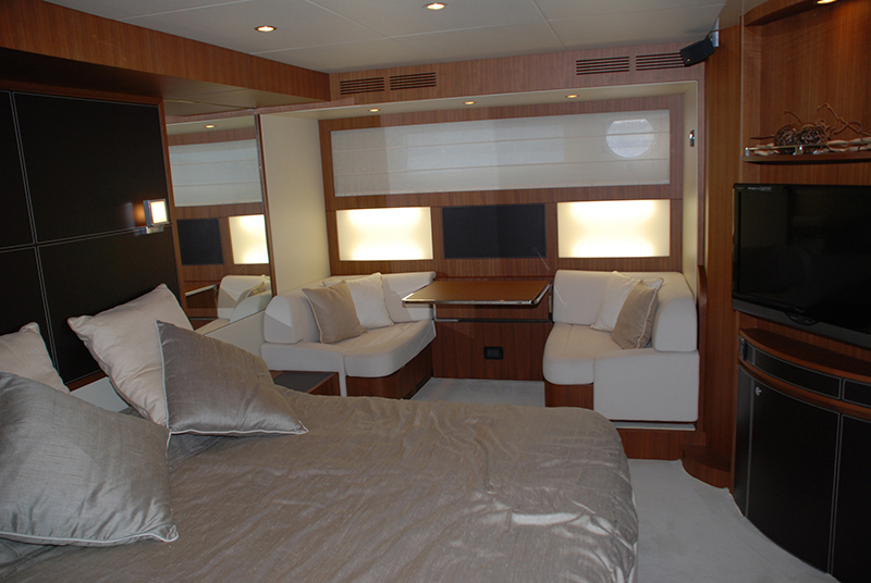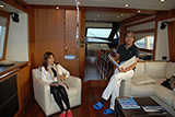 キャビンのつくり込みはまさにリーヴァ。上質なレザーのソファーとウッディな世界が乗員を和ませる。ギャレーも広く装備も充実しているので、パーティスペースとしても不満はなさそうだ。というか、この上ないリッチな気分にさせてくれる。大型モニターでお気に入りの映画でも流せば、そこが海の上であることも忘れてしまうだろう。ちなみに、リーヴァの歴史は今年で170年。現在はFerrettiグループに属しているが、世界のリーヴァオーナーから愛され続けているのは変わりない。