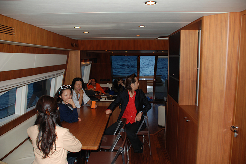 乗船してまず目につくのはアフトデッキのチーク。リーヴァらしさを目の当たりにする瞬間だ。レーシングヨットで名を馳せるリーヴァの高性能かつゴージャスな世界が一瞬にして広がる。そしてそのままFB(フライブリッジ)へと上り、この船の大きさを把握する。75フィート……。普段仕事で扱う20〜40フィートクラスとはまったくのベツモノだ。