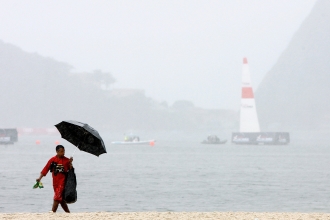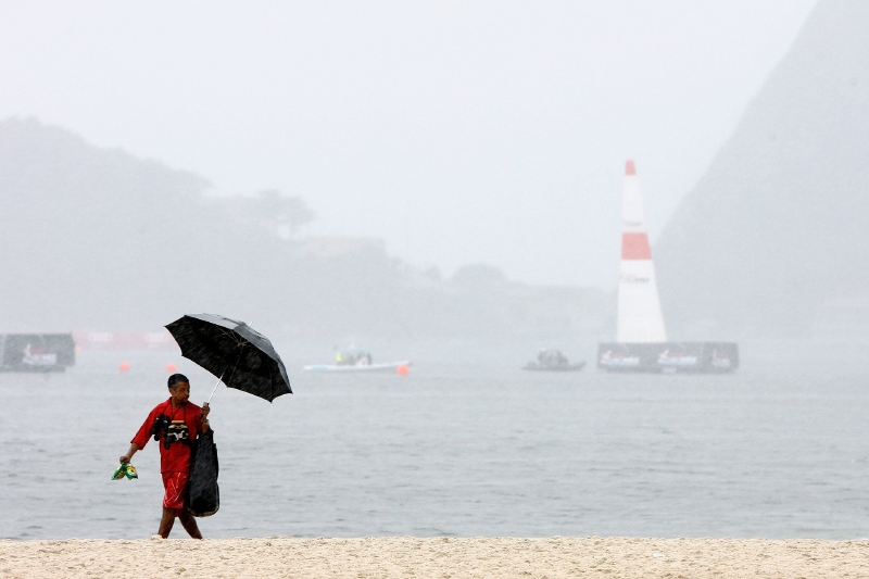 朝から降り出した雨は一度あがり、ワイルドカードは行われたが、トップ12が始まって、4人が飛んだところで雨が激しく降り出し、レースは中断された。その後、天候の回復を待ったが、雨、風とも激しさを増すばかり。結局、レッドブル・エアレース第3戦は、ここで打ち切りとなった。